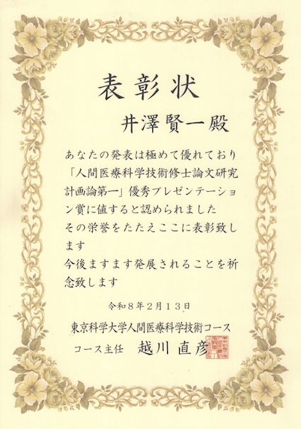 2026年2月13日開催の人間医療科学技術コース「修士論文研究計画論第一」にて、井澤賢一さん(M1)が優秀プレゼンテーション賞を受賞しました。おめでとうございます!